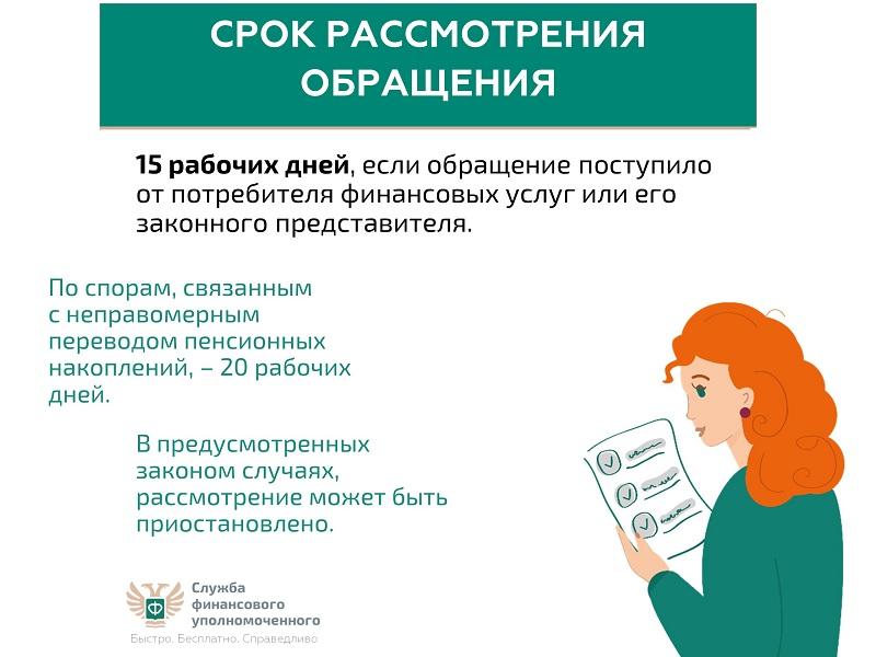 Ваши обращения финансовый уполномоченный рассматривает 15 рабочих дней (по спорам, связанным с неправомерным переводом пенсионных накоплений, – 20 рабочих дней) – без вашего визита. Никуда не нужно ходить.