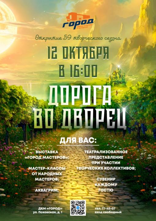 12 октября 2025 года в 16:00 Дворец культуры и молодежи "ГОРОД" (Псковская ул., д.1) приглашает на открытие 59-го творческого сезона. В ходе театрализованного представления «Дорога во дворец» новгородцев и гостей города познакомят с творческими коллективами «Первого дома на Псковской».