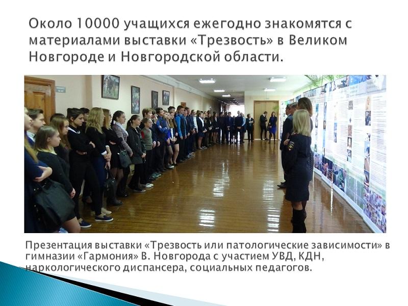 «В Великом Новгороде и районах Новгородской области проводим тематические выставки, семинары, а также экскурсии по реабилитационному центру для наркозависимых. Реализуем проекты ЗОЖ. Например, передвижная выставка "Трезвость или патологические зависимости" состоит из 22 стендов по профилактике алкоголизма, курения и наркомании, является помощником в профилактической работе педагогов. Школьники самостоятельно знакомятся с наглядным материалом. Возможно обсуждение и квесты по материалам выставки. Совместно с комитетом по образованию составляем график проведения выставки в школах и гимназиях», - уточнила Ирина Фролова.