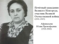 28 марта 2025 года Афанасьевой Юлии Прокофьевне, участнику Великой Отечественной войны 1941-1945 гг., решением Думы Великого Новгорода № 300 присвоено звание "Почетный гражданин Великого Новгорода".