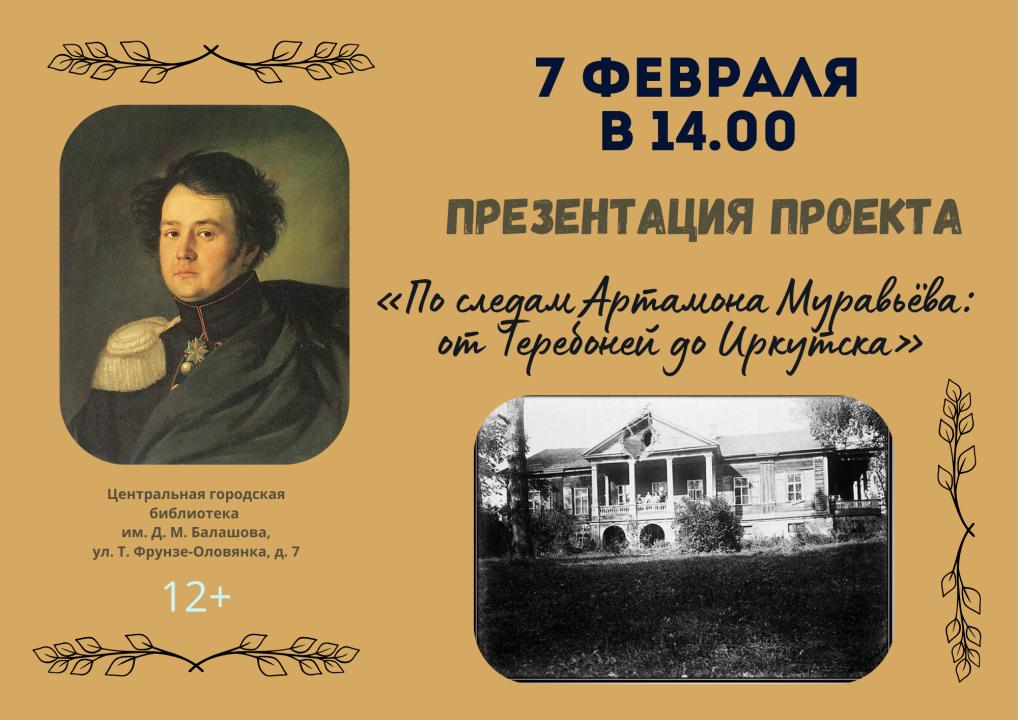 7 февраля 2026 года в 14:00 центральная городская библиотека им. Д.М. Балашова (МБУК «Библионика», ул. Т. Фрунзе-Оловянка, д.7) приглашает новгородцев, интересующихся историей и краеведением, а также любителей путешествий по окрестностям Великого Новгорода на презентацию проекта «По следам Артамона Муравьёва: от Теребоней до Иркутска», победившем в региональном конкурсе «Новгородика» в 2025 году.