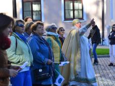 Гости - участники Клуба путешествующих по России RussiaTravel.club - получили памятные флажки проекта «Серебряное ожерелье России», прогулялись по историческому центру Великого Новгорода с посадницей Евфимией, погрузились в атмосферу средневекового Новгорода и узнали об истории города, легендах и преданиях, связанных с Кремлем и Софийским Собором, услышали увлекательные истории о купцах новгородских, да заморских, об иностранных дворах, которые когда-то находились на Ярославовом Дворище.