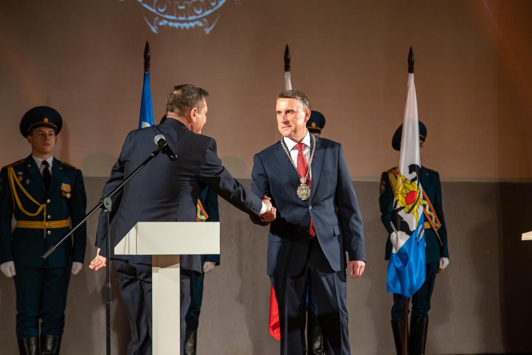 Регалии Мэра вручил Александру Розбауму председатель Думы Великого Новгорода Алексей Митюнов.